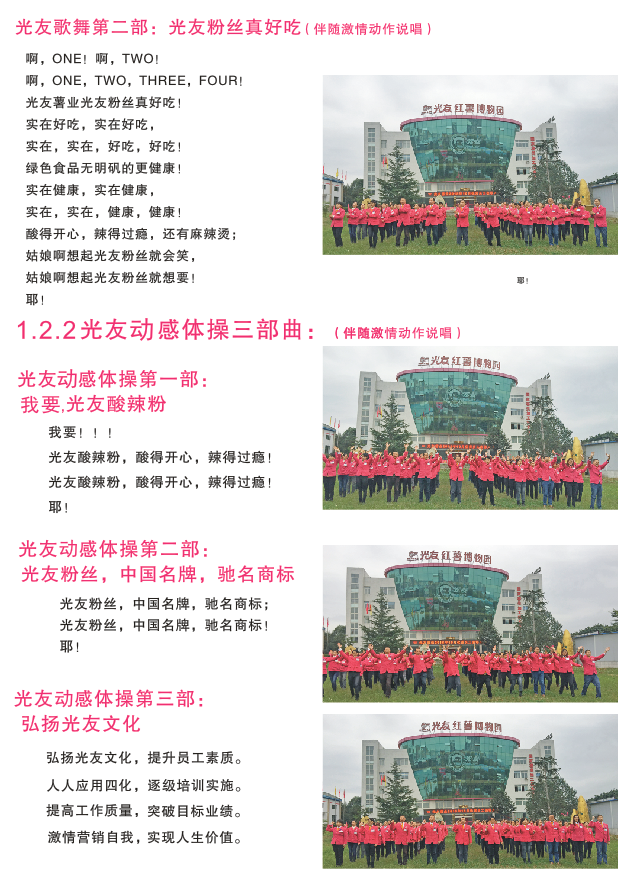 光友薯業(yè)歷來(lái)重視企業(yè)文化的發(fā)展和創(chuàng)新,29年來(lái),已形成獨(dú)具特色、富有激情、 富有正能量的企業(yè)文化,光友文化是光友薯業(yè)的靈魂,是光友人共有的價(jià)值觀和行為準(zhǔn)則,對(duì)員工無(wú)時(shí)不產(chǎn)生指導(dǎo)、熏陶、感染、規(guī)范的潛移默化作用,是形成團(tuán)隊(duì)凝聚力的原動(dòng)力,引導(dǎo)員工積極進(jìn)取,快樂(lè)生活、快樂(lè)工作、走向成功。