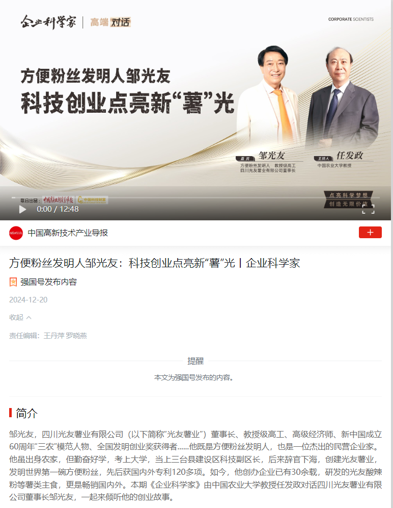 轉(zhuǎn)載學(xué)習(xí)強國中國高新技術(shù)產(chǎn)業(yè)導(dǎo)報——方便粉絲發(fā)明人鄒光友:科技創(chuàng)業(yè)點亮新“薯”光丨企業(yè)科學(xué)家