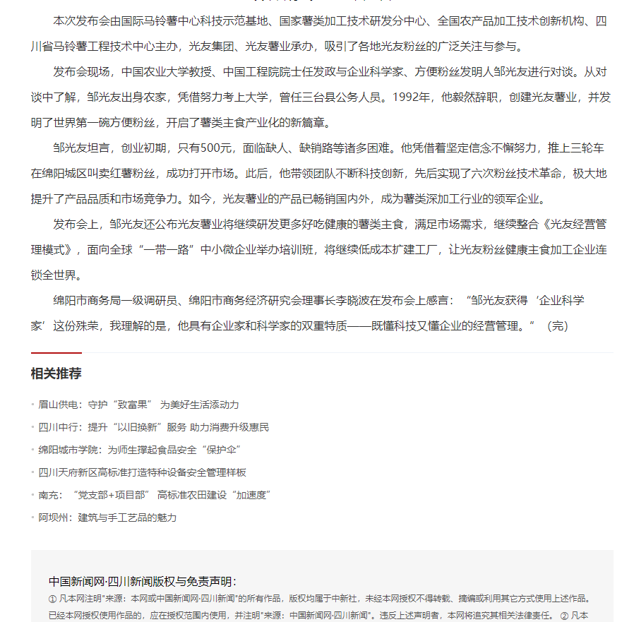 轉(zhuǎn)載中國新聞網(wǎng)·四川新聞——方便粉絲發(fā)明人鄒光友:科技創(chuàng)業(yè)點亮新“薯”光